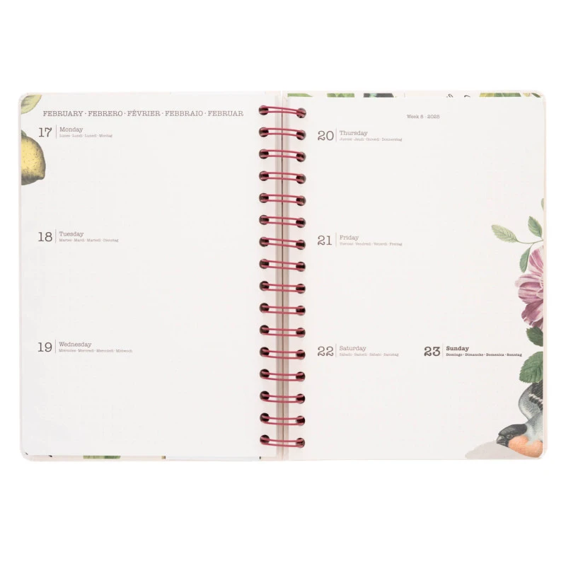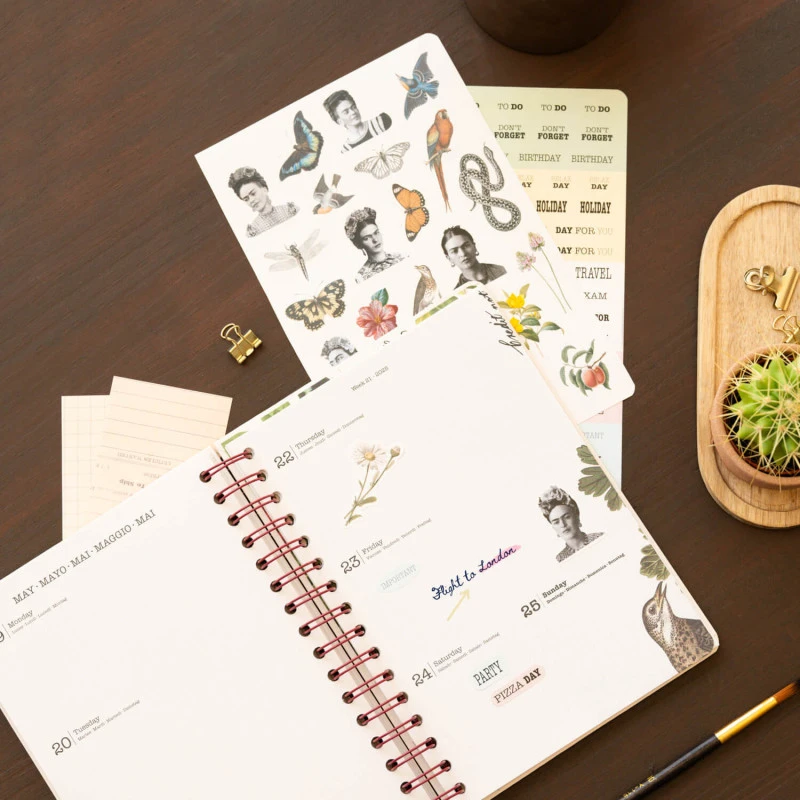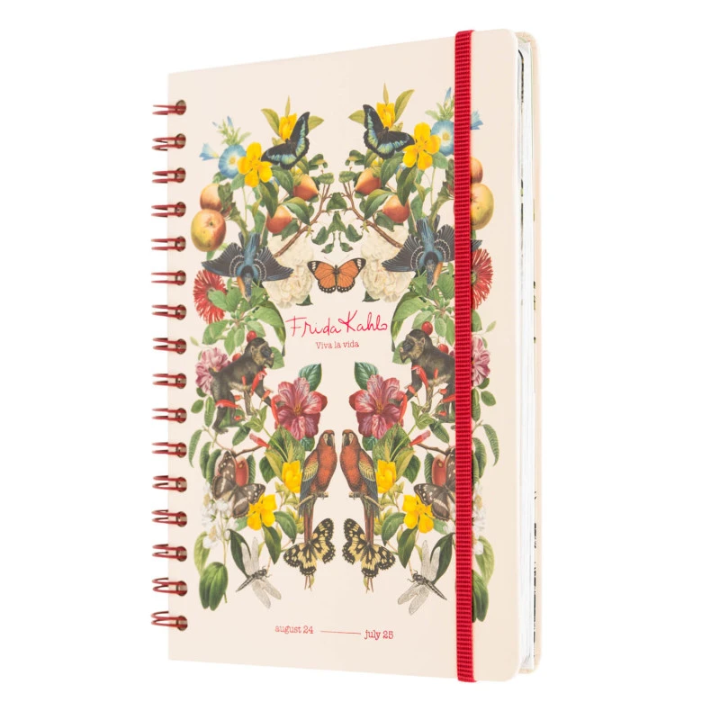 Esta agenda escolar de Frida Kahlo tiene una duración total de 12 meses que abarcan desde Agosto de 2024 hasta Julio de 2025. Su formato es de semana vista y tiene tamaño A5, con unas medidas de 14,8 cm de ancho por 21 cm de alto.