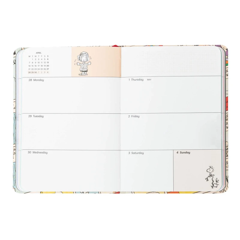 Esta agenda escolar de Snoopy tiene una duración total de 17 meses que abarcan desde Agosto de 2024 hasta Diciembre de 2025. Su formato es de semana vista y tiene tamaño pocket, con unas medidas de 11 cm de ancho por 15,5 cm de alto.