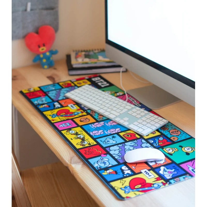 Este mousepad de BT21 es el complemento ideal para darle a tu escritorio o setup gaming un toque único y original. Su tamaño XL de 80 centímetros de ancho por 35 de alto te aporta un espacio amplio que permite la colocación tanto del teclado como del ratón.