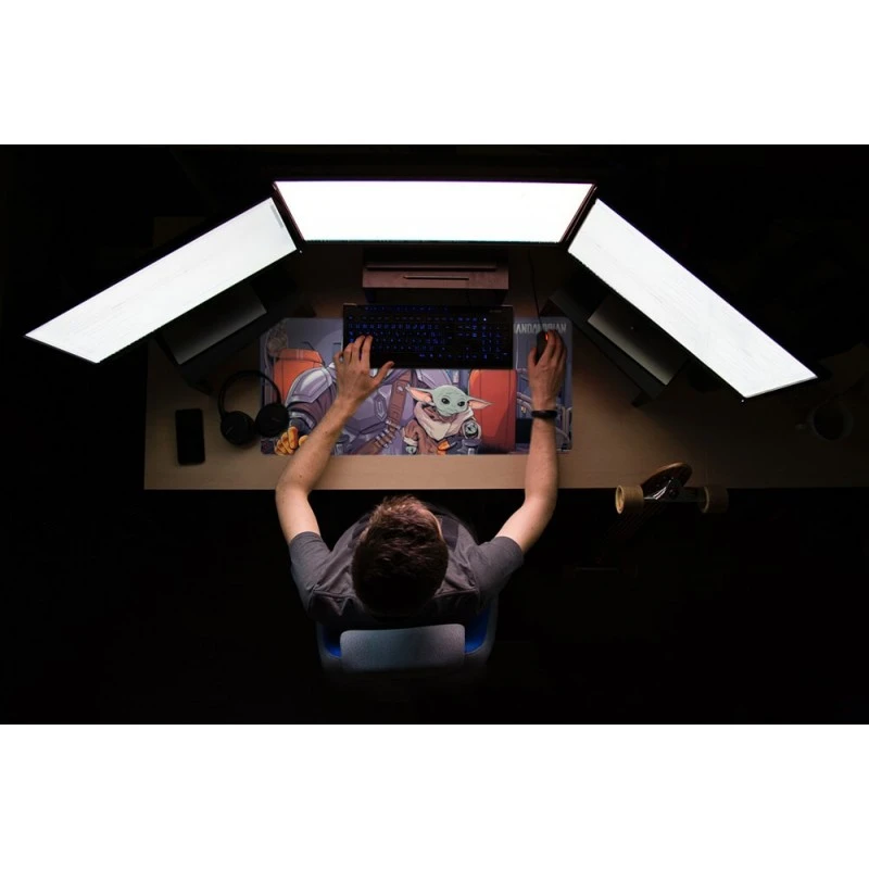 Este mousepad inspirado en la serie Star Wars: The Mandalorian es el complemento ideal para darle a tu escritorio o setup un toque único y original. Su tamaño XL de 80 centímetros de ancho por 35 de alto te aporta un espacio amplio que permite la colocación tanto del teclado como del ratón.