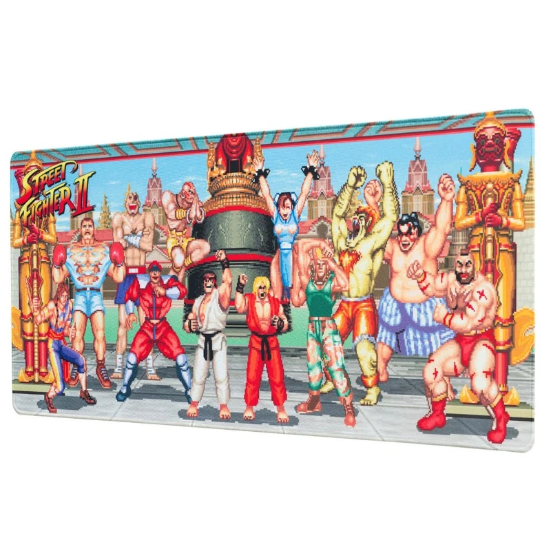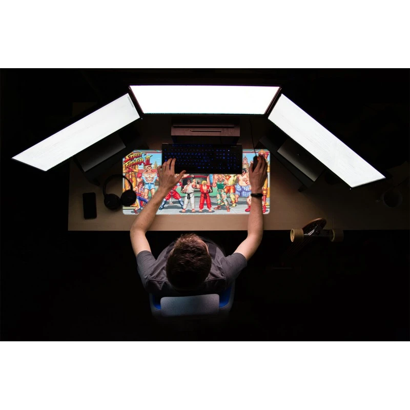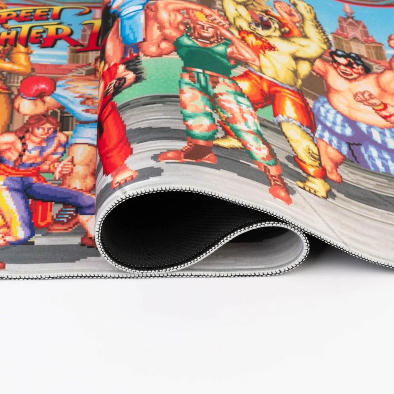 Este mousepad del videojuego Street Fighter es el complemento ideal para darle a tu escritorio o setup gaming un toque único y original. Su tamaño XL de 80 centímetros de ancho por 35 de alto te aporta un espacio amplio que permite la colocación tanto del teclado como del ratón.