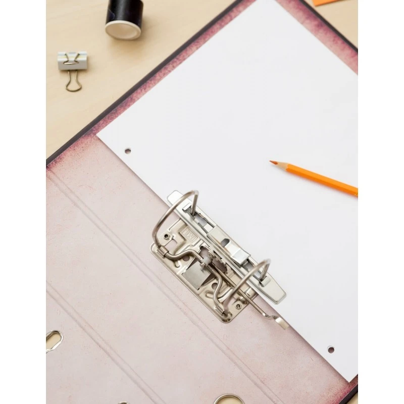 Respecto a su interior, tiene diseño personalizado acorde al exterior y cuenta con mecanismo de palanca y compresor metálico. Está pensada para almacenar, principalmente, hojas tamaño A4.