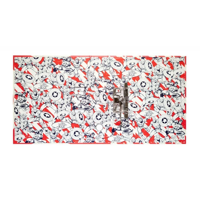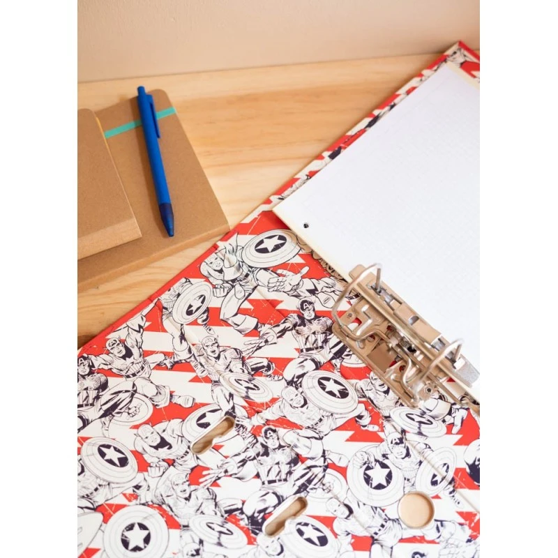 Si eres fan de Marvel y en especial del Capitán América, este archivador con compresor debería ser tuyo. Fabricada con materiales de una gran calidad, Elaboradas con tapa dura de cartón de 2 mm de espesor y forradas con papel laminado en mate. Tienen un tamaño de 26X32 cm, encuadernación de 2 anillas, cierre con banda elástica de 9 mm y diseño interior personalizado.