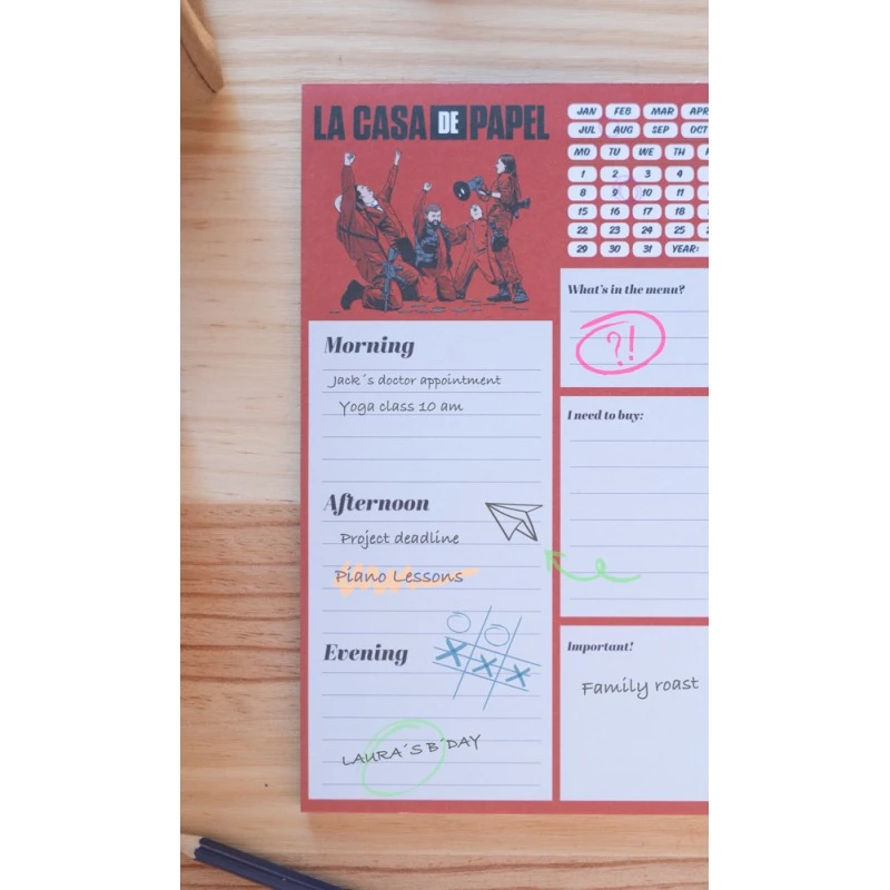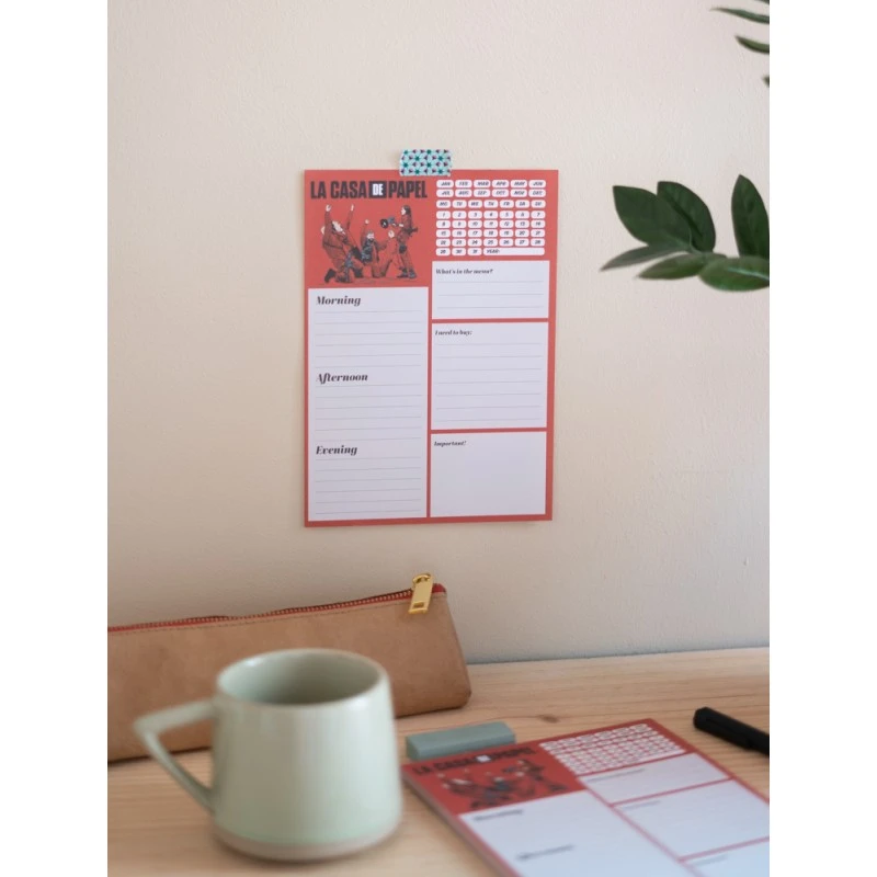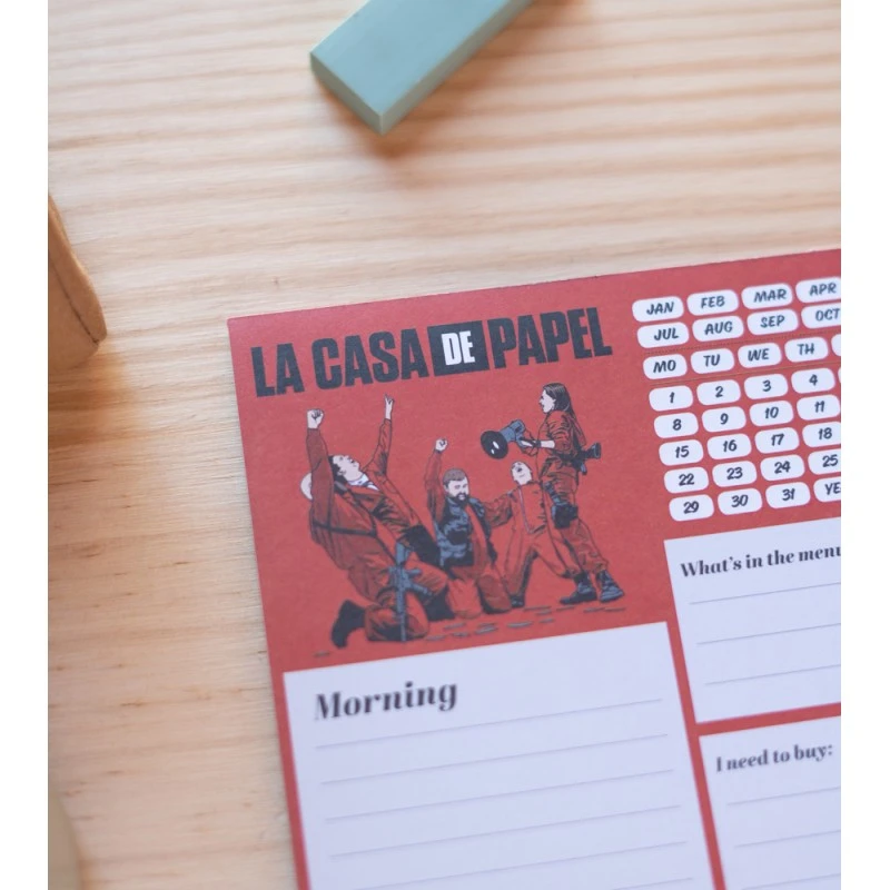 Bloc Notas de Escritorio La Casa De Papel si buscabas una forma de llevar al día tus notas ya la encontraste. Este bloc tiene un diseño para que no dejes escapar nada como lista de la compra, notas para el día a día, un pequeño calendario en la parte superior. Esta compuesto por 54 páginas impresas a todo color a una sola cara en papel de 90 gr. Tiene una medida A5.