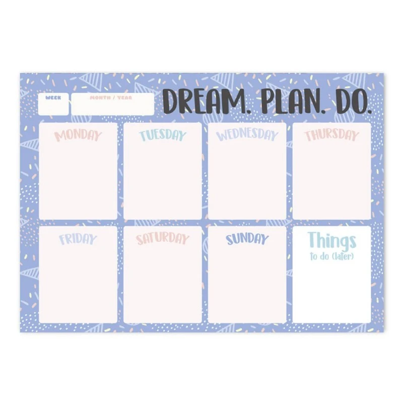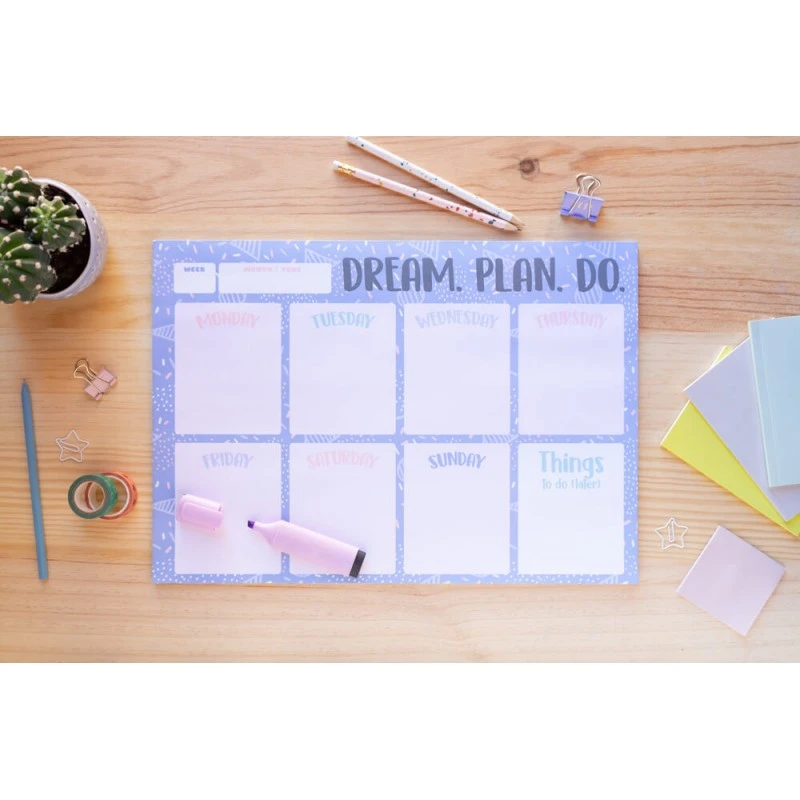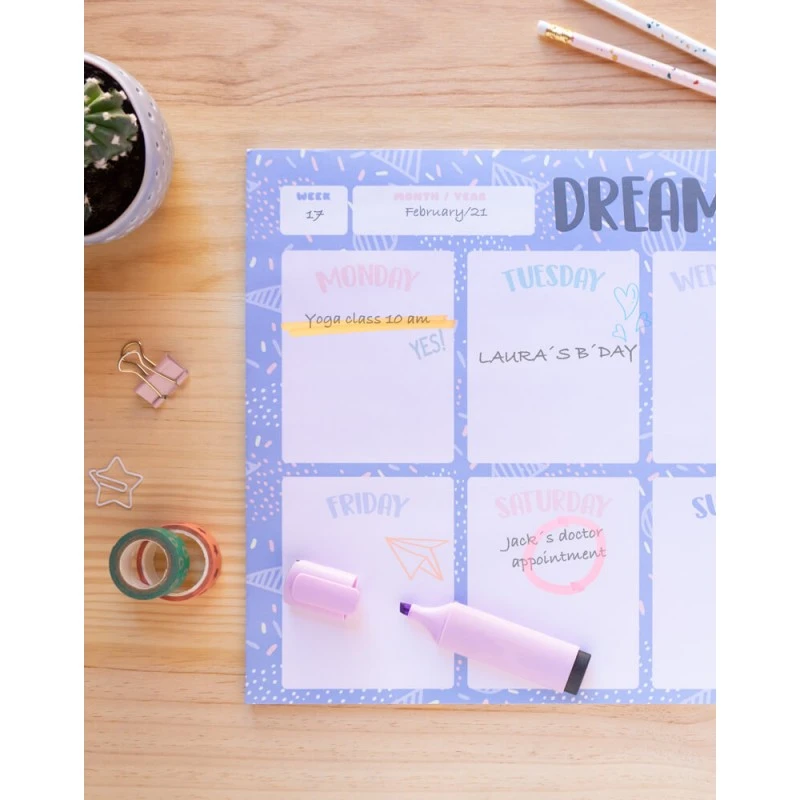 ¿Buscas un utensilio práctico para anotar todas las informaciones al trabajo, a clases o simplemente en tu tiempo libre? El nuevo bloc planificador semanal A3 es la solución. Fabricados con materiales de gran calidad, siguiendo los diseños de la marca Amelie. Este producto está impreso a todo color en una cara en papel de 90 gr y las hojas están encoladas en el lado corto (orientación horizontal) y no tienen cubierta. Medidas: 29,7 x 42 cm. Cuenta con espacio de notas para cada día de la semana y espacio para las notas más importantes de la semana.
