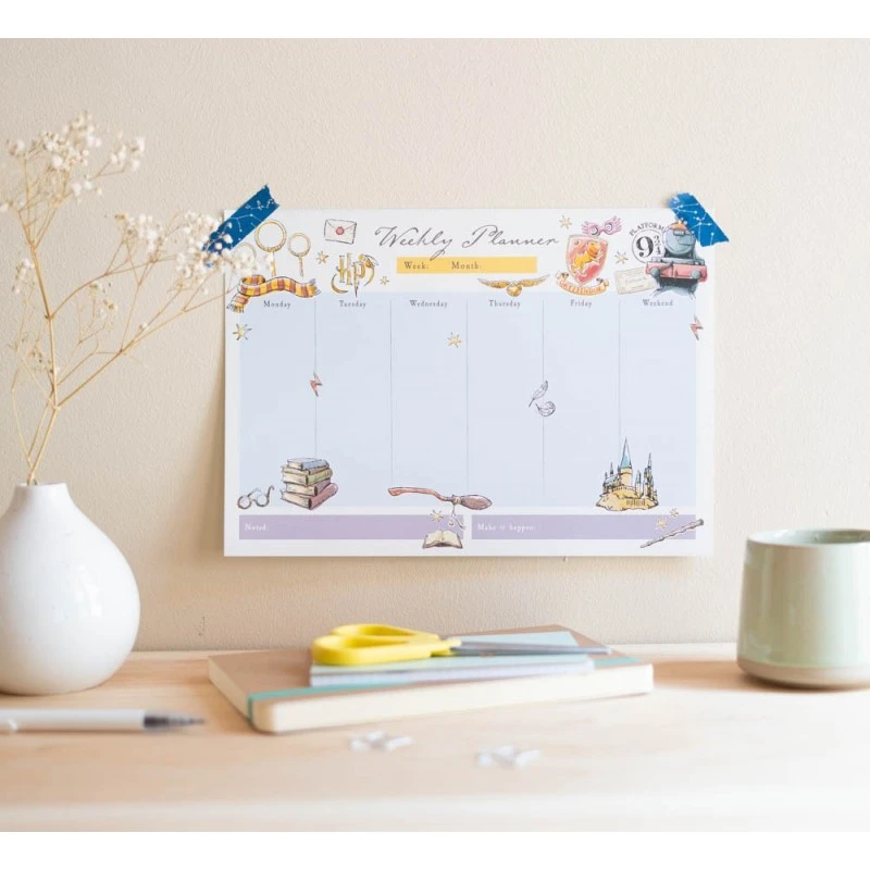 ¿Eres de los que no puede pasar sin un planificador para que no se le escape nada? No tendrás que realizar ningún hechizo para acordate de todo, solo necesitarás este planificador de Harry Potter. En tamaño A4. Fabricados con materiales de gran calidad, impreso a todo color en una cara en papel de 90 gr y las hojas están encoladas en orientación horizontal. No tienen cubierta. Medidas: 29,7 x 21 cm. Cuenta con espacio de notas para cada día de la semana y espacio para las notas más importantes de la semana.