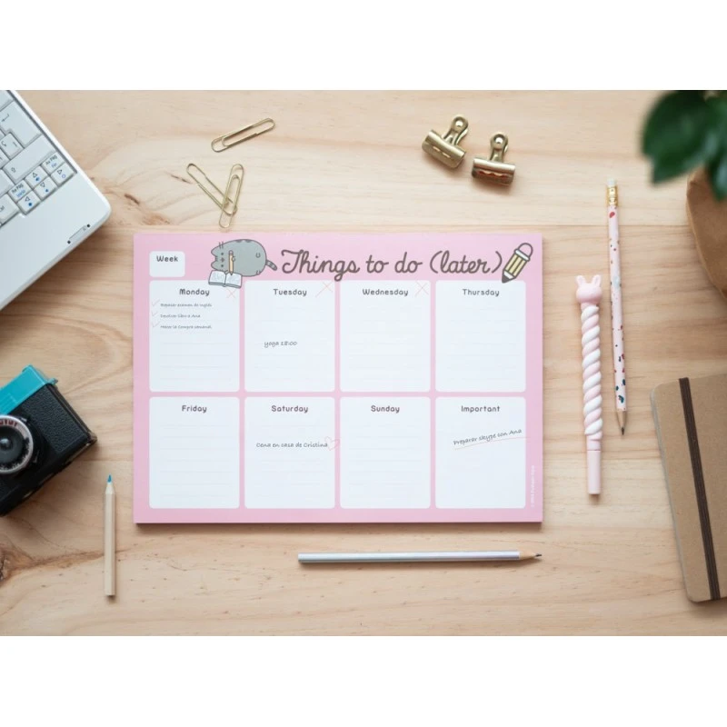 Bloc Planificador Semanal A4 Pusheen Rose Collection si buscabas una forma de llevar tus notas al día y no olvidar nada ya la has encontrado. Este bloc esta pensado para no dejar nada al azar, tiene espacio destinado para anotar diarimente lo que necesites en formato semanal, también incluye un espacio para notas genérico por si necesitas apuntar algo a parte. Tiene una orientación horizontal. Está impreso a todo color en una cara en papel de 90gr.