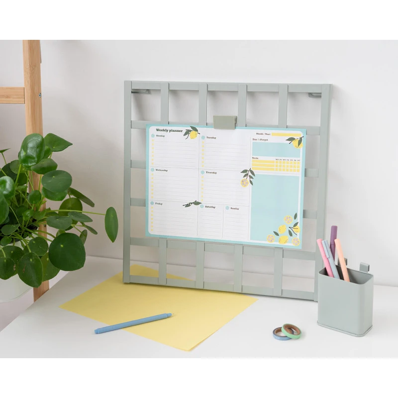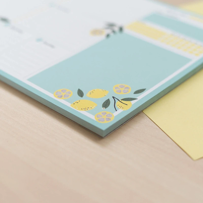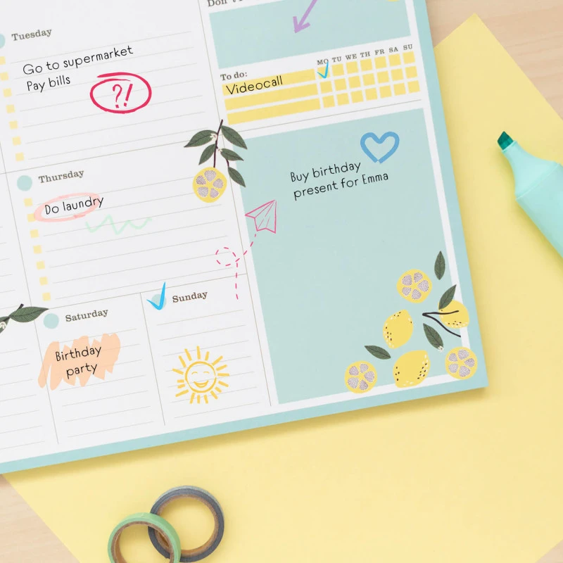 El bloc planificador semanal Fresh Start contiene 54 hojas de tamaño tamaño A4 (29,7 x 21 cm) impresas a todo color en papel de 90 gramos. Cuenta con múltiples espacios para realizar anotaciones y planificar cada día de la semana.