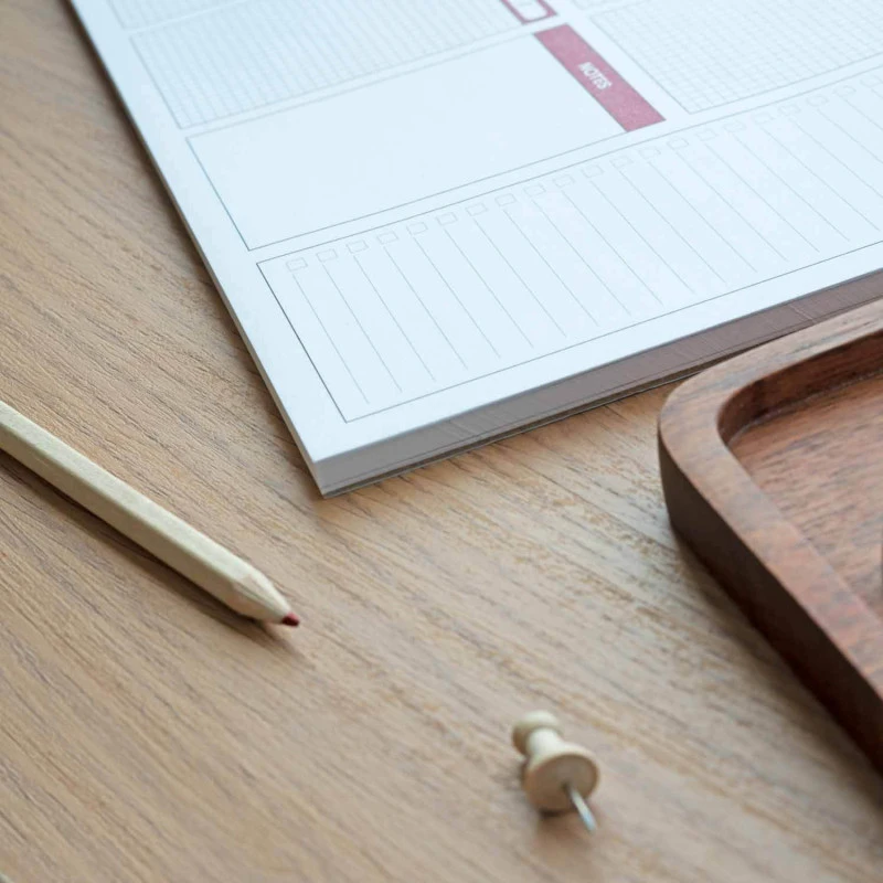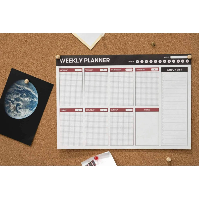 Este bloc planificador semanal genérico contiene 54 hojas de tamaño A4 (29,7 x 21 cm) impresas a todo color en papel de 90 gramos. Cuenta con múltiples espacios para realizar anotaciones y planificar cada día de la semana.