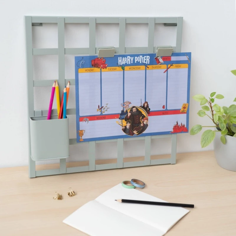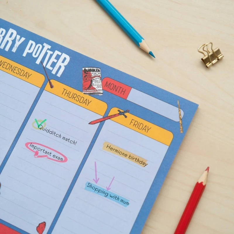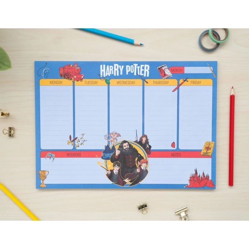 Este bloc planificador de Harry Potter es ideal para el curso escolar. Presenta 54 hojas de tamaño A4 impresas a todo color en papel de 90 gramos, con espacio para la planificación de cada día de la semana. Incluye recuadro para el mes o la fecha.