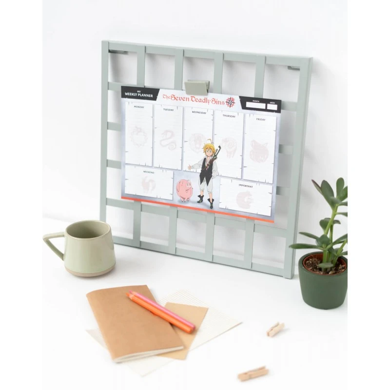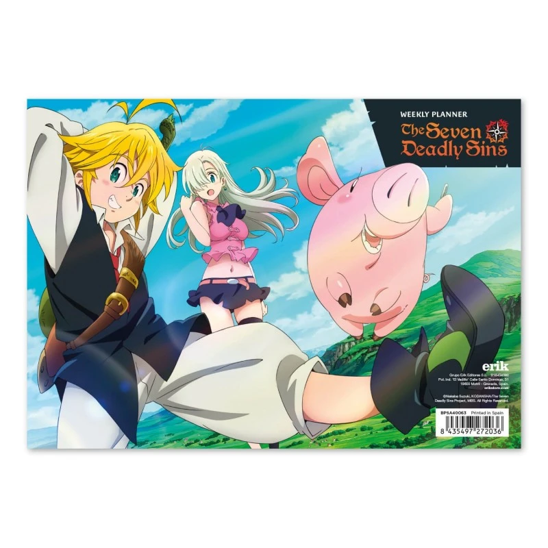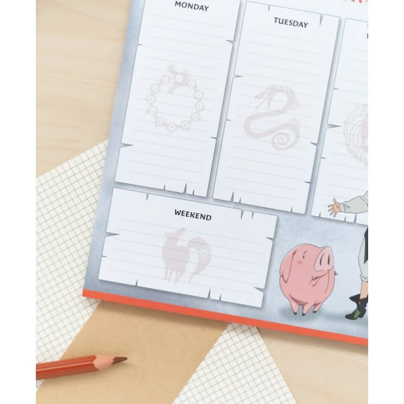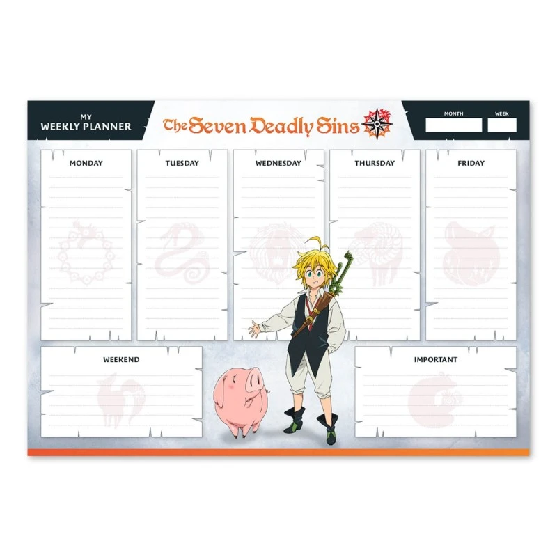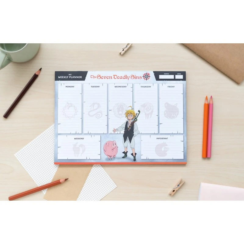 Este bloc planificador tiene 54 hojas de tamaño A4 impresas a todo color con detalles y dibujos basados en la serie de anime y manga Los Siete Pecados Capitales. Cuenta con espacios para planificar cada día de la semana más uno extra para anotaciones importantes. En la parte superior incluye varios recuadros para anotar el mes, la semana y otro tipo de observaciones.