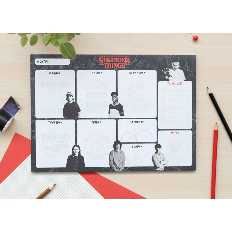 Este bloc planificador de Stranger Things es ideal para el curso escolar. Presenta 54 hojas de tamaño A4 impresas a todo color en papel de 90 gramos, con espacio para la planificación de cada día de la semana. Incluye recuadro para el mes o la fecha.