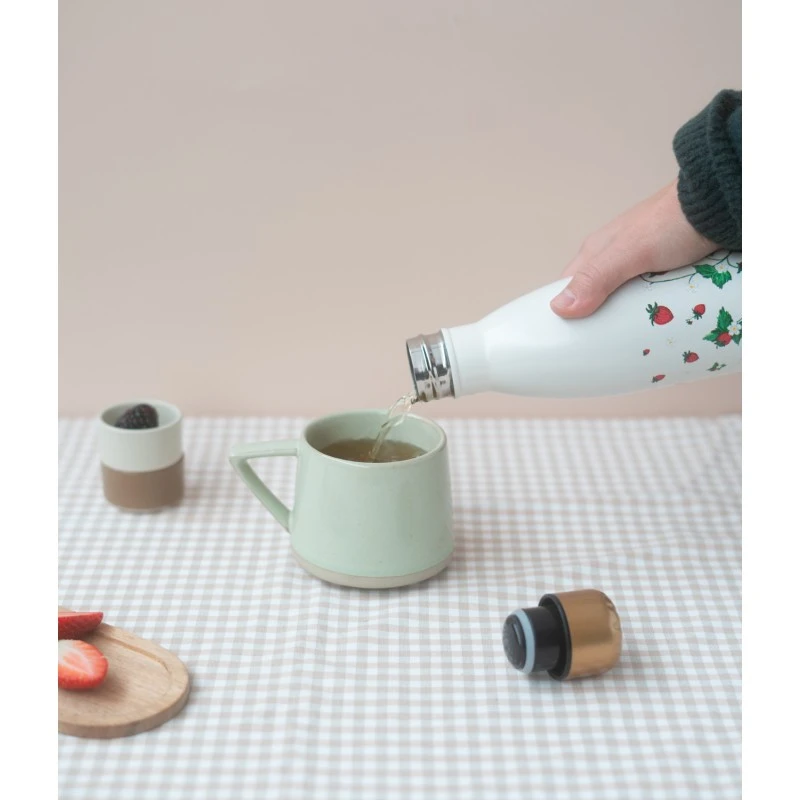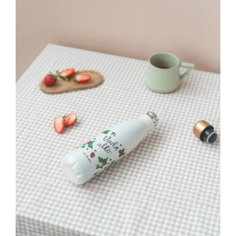 Esta botella metálica cuenta con un diseño especial de la dibujante e ilustradora Ana Marín, compuesto por detalles florales con fresas y la frase ‘Vuela alto’, escrita con la tipografía personal de la artista.