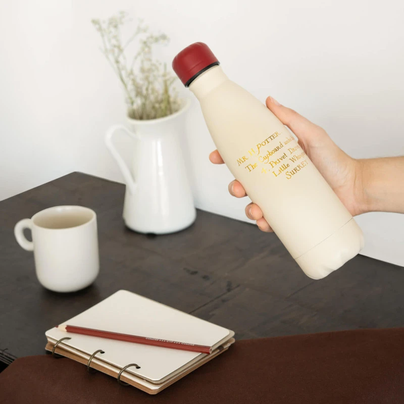 Esta botella metálica de Harry Potter con diseño inspirado en Hedwig es el complemento ideal para disfrutar de tu bebida favorita en cualquier lugar. Tiene capacidad para 500 mililitros y mide 26 cm de alto y 7 cm de diámetro.