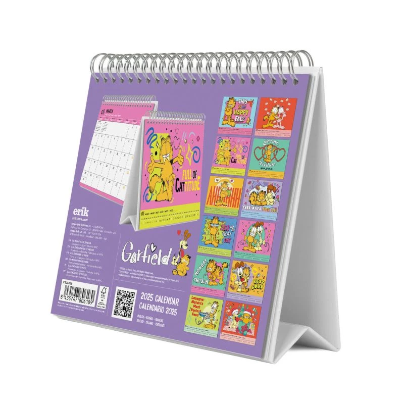 Este calendario de escritorio de Garfield tiene una duración total de 12 meses que abarcan desde Enero hasta Diciembre de 2025. Incluye diferentes imágenes para cada mes del año y cuenta con dos formatos diferentes de calendario mensual, uno de ellos con espacio diario para anotaciones. Idiomas: inglés, español, francés, alemán, italiano y portugués.