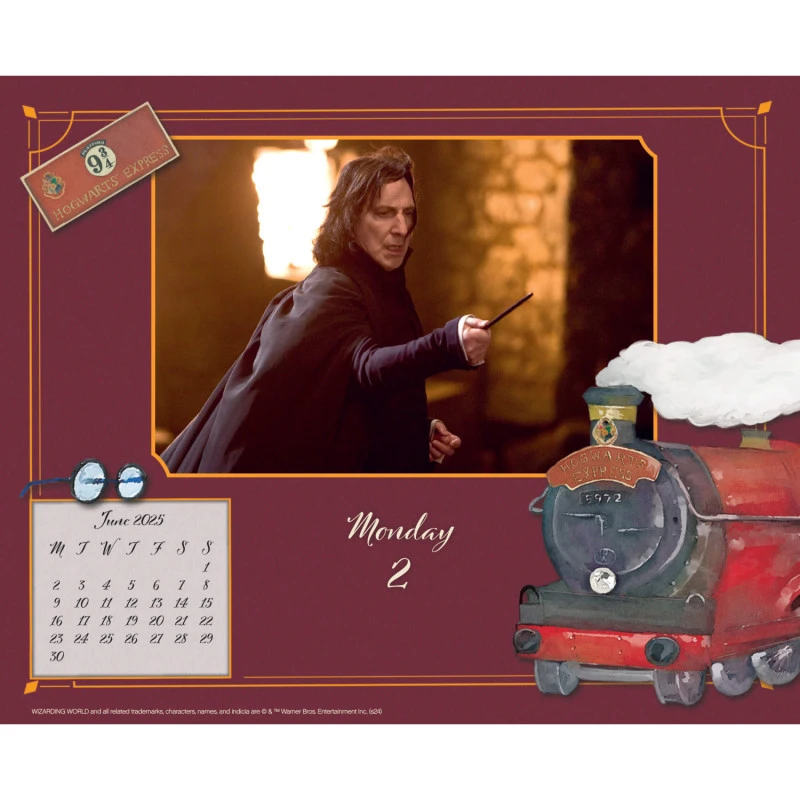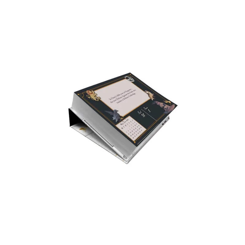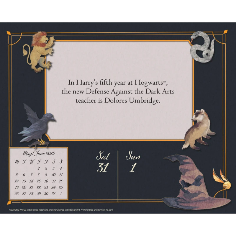 Este calendario de escritorio de Harry Potter tiene una duración total de 12 meses que abarcan desde Enero hasta Diciembre de 2025. Cuenta con una página desprendible para cada día del año que incluye diferentes imágenes, citas, curiosidades o adivinanzas. Se coloca en posición horizontal y la cubierta superior se dobla haciendo de soporte. Los textos están en inglés.
