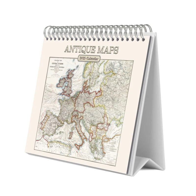 El calendario de escritorio Antique Maps tiene una duración total de 12 meses que abarcan desde Enero hasta Diciembre de 2025. Incluye diferentes imágenes para cada mes del año y cuenta con dos formatos diferentes de calendario mensual, uno de ellos con espacio diario para anotaciones. Idiomas: inglés, español, francés, alemán, italiano y portugués.