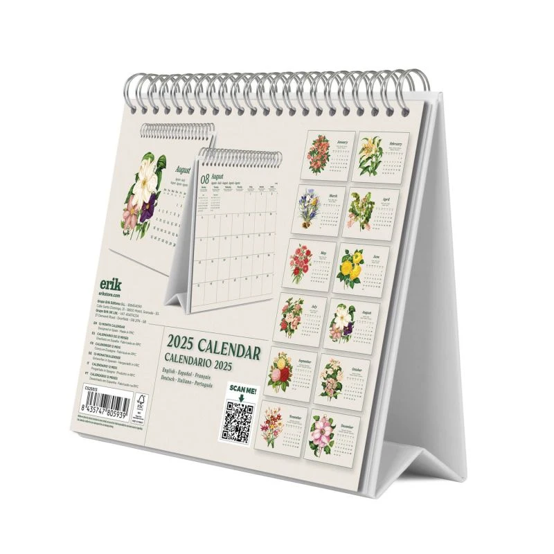 El calendario de escritorio Vintage Flowers tiene una duración total de 12 meses que abarcan desde Enero hasta Diciembre de 2025. Incluye diferentes imágenes para cada mes del año y cuenta con dos formatos diferentes de calendario mensual, uno de ellos con espacio diario para anotaciones. Idiomas: inglés, español, francés, alemán, italiano y portugués.