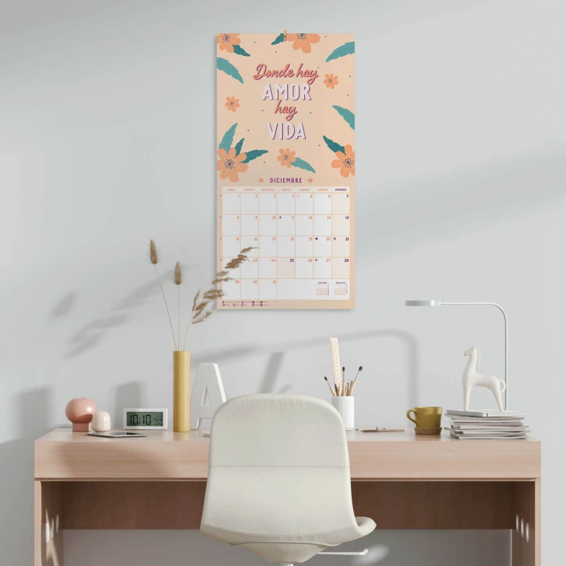 Este calendario de pared de Amelie tiene una duración total de 16 meses que abarcan desde Septiembre de 2024 hasta Diciembre de 2025. Contiene 12 imágenes con frases bonitas y motivadoras en su interior. Respecto a su tamaño, mide 30 centimetros de ancho por 60 de alto (abierto). Los textos y las frases están en español.