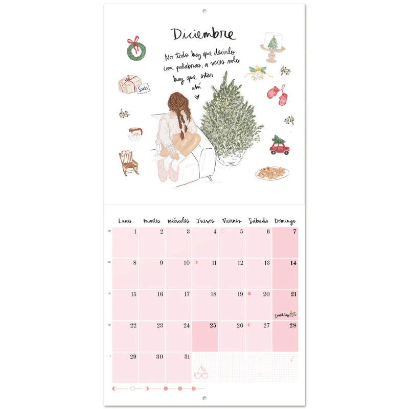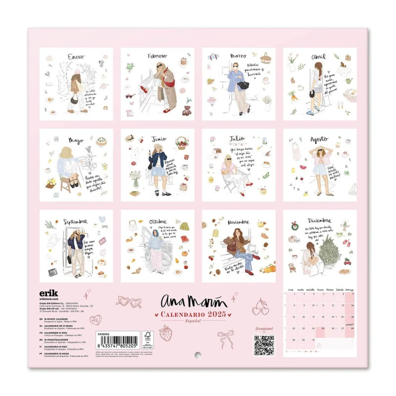 Este calendario de pared de Ana Marín tiene una duración total de 16 meses que abarcan desde Septiembre de 2024 hasta Diciembre de 2025. Contiene 12 ilustraciones de la artista acompañadas de frases motivadoras. Respecto a su tamaño, mide 30 centimetros de ancho por 60 de alto (abierto). Idioma: español.
