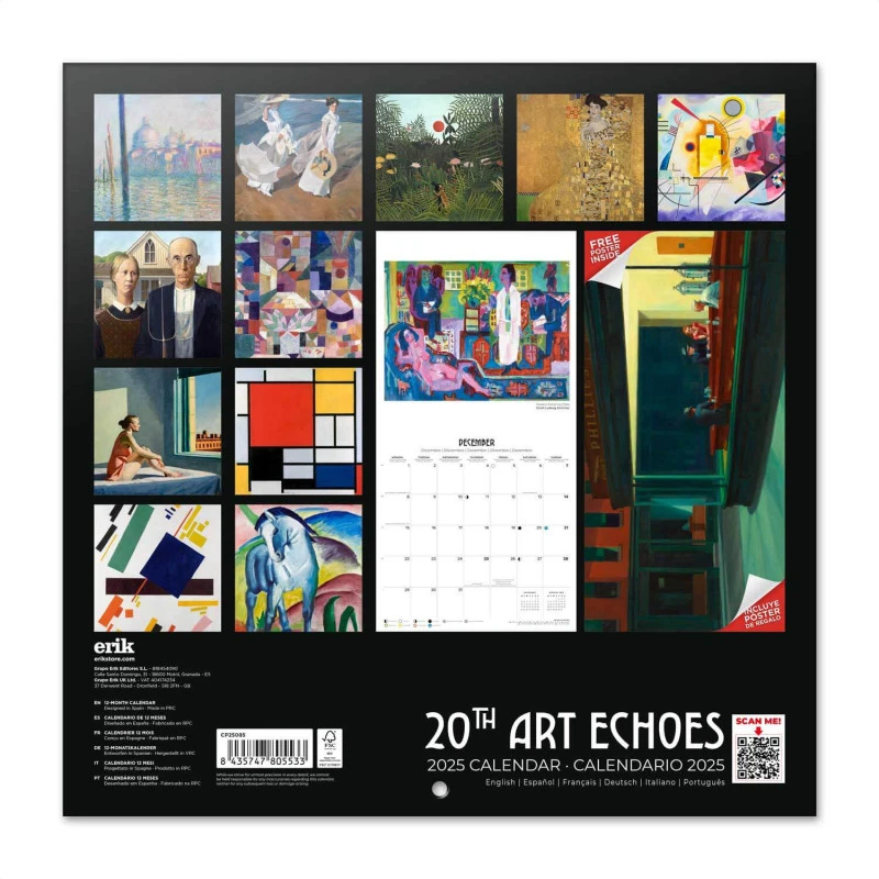 Este calendario de pared de Arte del Siglo XX tiene una duración total de 12 meses que abarcan desde Enero hasta Diciembre de 2025. Contiene 12 imágenes en su interior con diferentes obras de arte del siglo XX. Respecto a su tamaño, mide 30 centimetros de ancho por 60 de alto (abierto). Idiomas: inglés, español, francés, alemán, italiano y portugués.