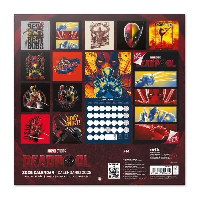 Este calendario de pared de Deadpool tiene una duración total de 12 meses que abarcan desde Enero hasta Diciembre de 2025. Contiene 12 ilustraciones y un póster en su interior. Respecto a su tamaño, mide 30 centimetros de ancho por 60 de alto (abierto). Idiomas: inglés, español, francés, alemán, italiano y portugués.
