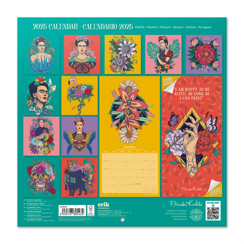 Este calendario de pared de Frida Kahlo tiene una duración total de 12 meses que abarcan desde Enero hasta Diciembre de 2025. Contiene 12 ilustraciones de la artista y un póster en su interior. Respecto a su tamaño, mide 30 centimetros de ancho por 60 de alto (abierto). Idiomas: inglés, español, francés, alemán, italiano y portugués.