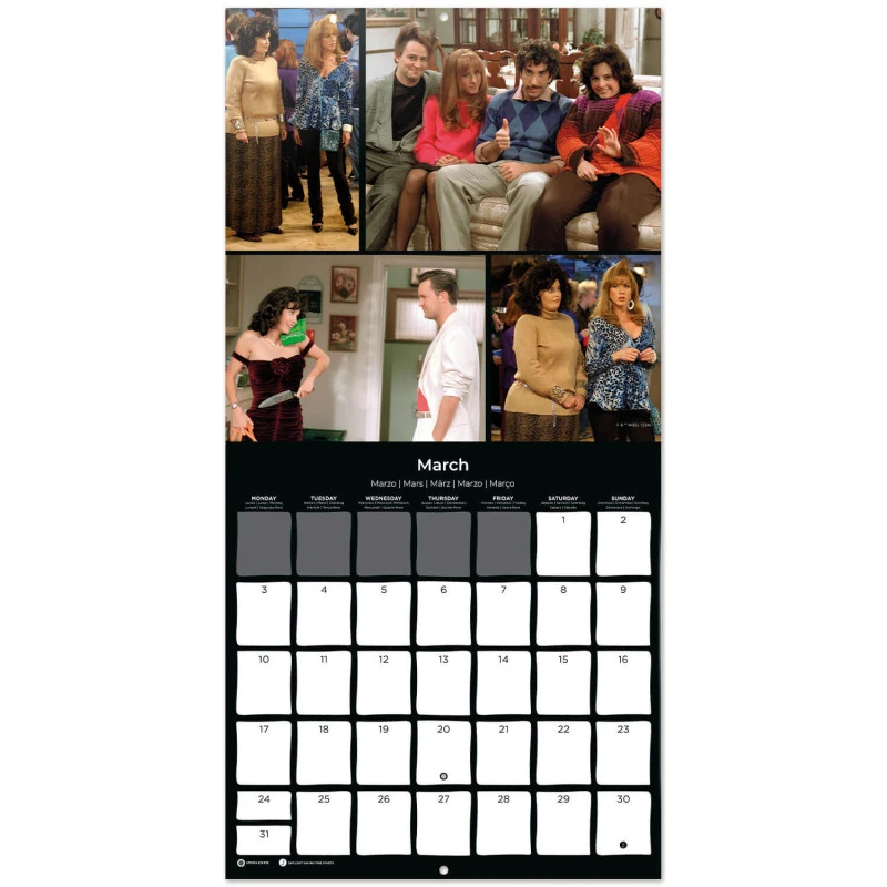 Este calendario de pared de Friends tiene una duración total de 12 meses que abarcan desde Enero hasta Diciembre de 2025. Contiene 12 imágenes y un póster en su interior. Respecto a su tamaño, mide 30 centimetros de ancho por 60 de alto (abierto). Idiomas: inglés, español, francés, alemán, italiano y portugués.