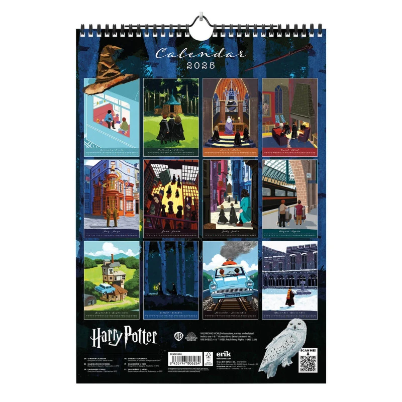 Este calendario de pared de Harry Potter tiene una duración total de 12 meses que abarcan desde Enero hasta Diciembre de 2025. Incluye 12 imágenes en su interior con diferentes ilustraciones inspiradas en las películas. Tiene tamaño A3 con unas medidas de 29,7 centímetros de ancho por 42 de alto. Los textos están en inglés.