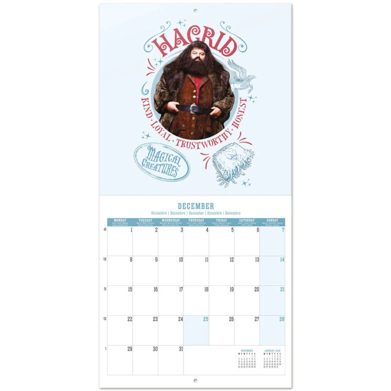 Este calendario de pared de Harry Potter tiene una duración total de 12 meses que abarcan desde Enero hasta Diciembre de 2025. Contiene 12 ilustraciones y un póster en su interior. Respecto a su tamaño, mide 30 centimetros de ancho por 60 de alto (abierto). Idiomas: inglés, español, francés, alemán, italiano y portugués.