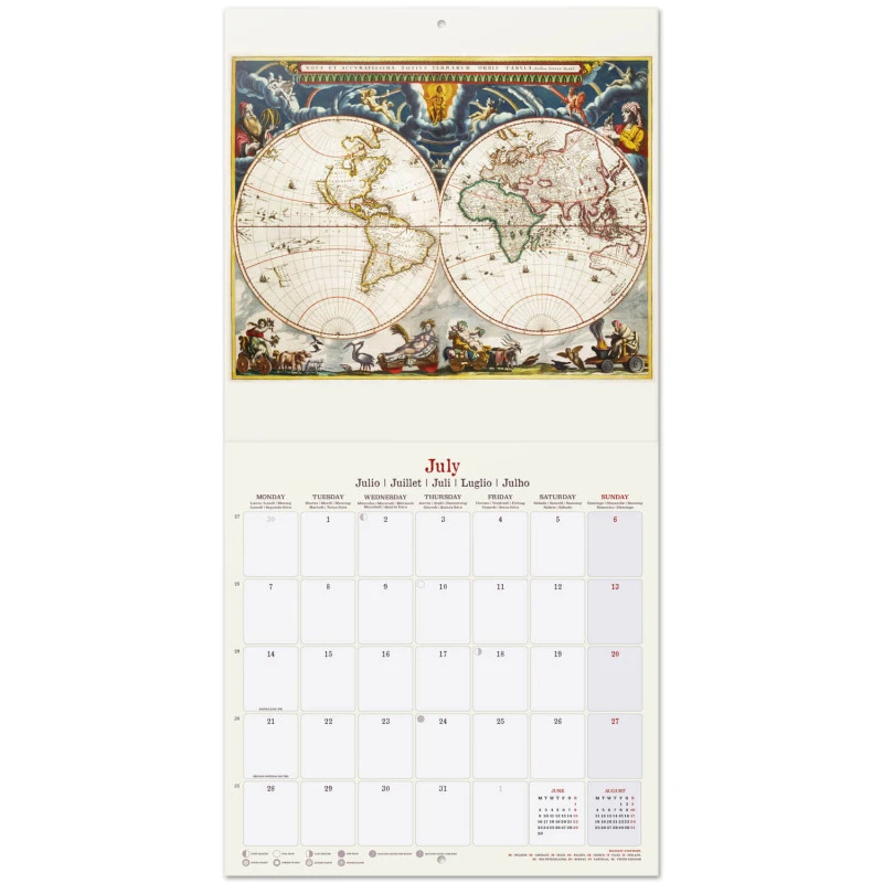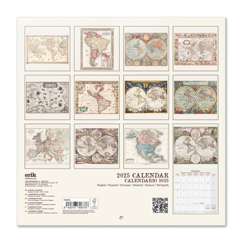 El calendario de pared Antique Maps tiene una duración total de 16 meses que abarcan desde Septiembre de 2024 hasta Diciembre de 2025. Contiene 12 imágenes de mapas antiguos en su interior. Respecto a su tamaño, mide 30 centimetros de ancho por 60 de alto (abierto). Idiomas: inglés, español, francés, alemán, italiano y portugués.