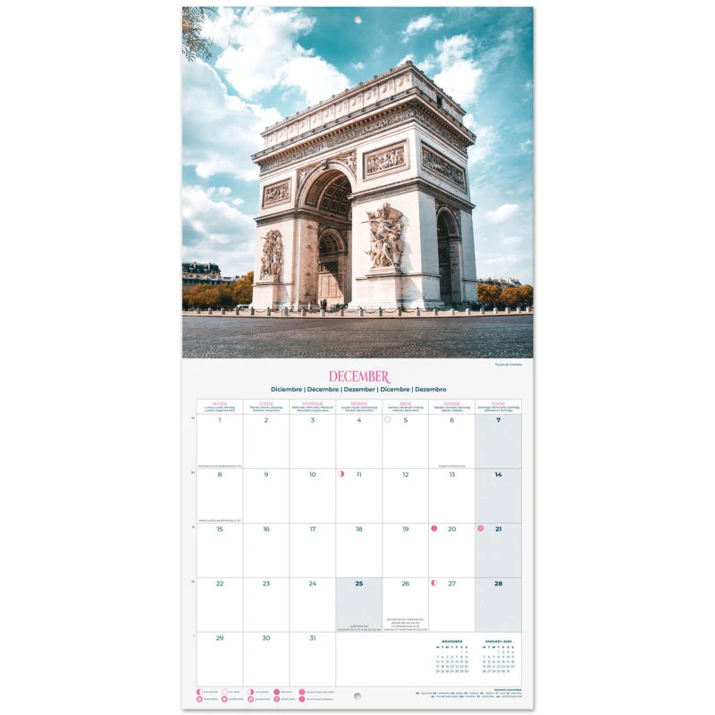 Este calendario de pared de París tiene una duración total de 16 meses que abarcan desde Septiembre de 2024 hasta Diciembre de 2025. Contiene 12 imágenes de diferentes lugares de París en su interior. Respecto a su tamaño, mide 30 centimetros de ancho por 60 de alto (abierto). Idiomas: inglés, español, francés, alemán, italiano y portugués.