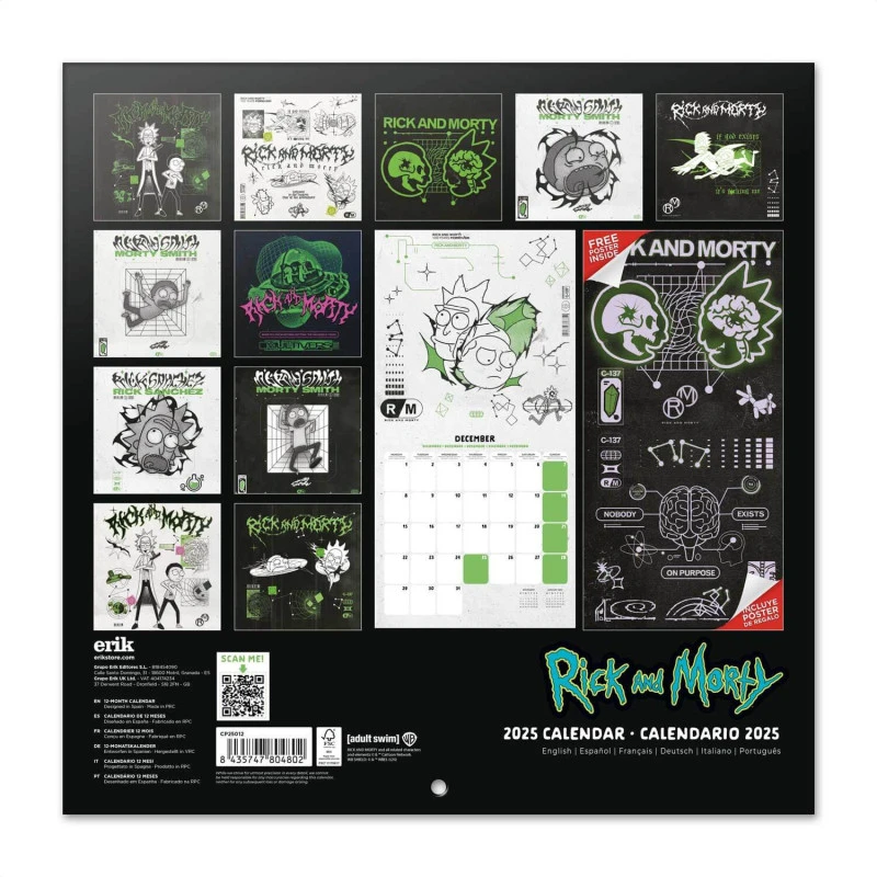 Este calendario de pared de Rick & Morty tiene una duración total de 12 meses que abarcan desde Enero hasta Diciembre de 2025. Contiene 12 imágenes y un póster en su interior. Respecto a su tamaño, mide 30 centimetros de ancho por 60 de alto (abierto). Idiomas: inglés, español, francés, alemán, italiano y portugués.