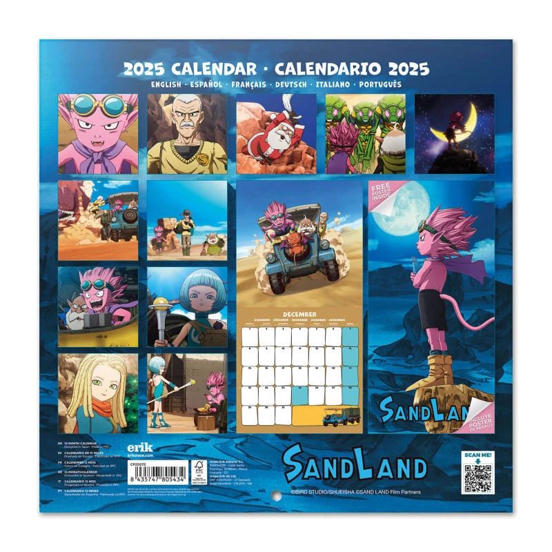Este calendario de pared de Sand Land tiene una duración total de 12 meses que abarcan desde Enero hasta Diciembre de 2025. Contiene 12 ilustraciones y un póster en su interior. Respecto a su tamaño, mide 30 centimetros de ancho por 60 de alto (abierto). Idiomas: inglés, español, francés, alemán, italiano y portugués.
