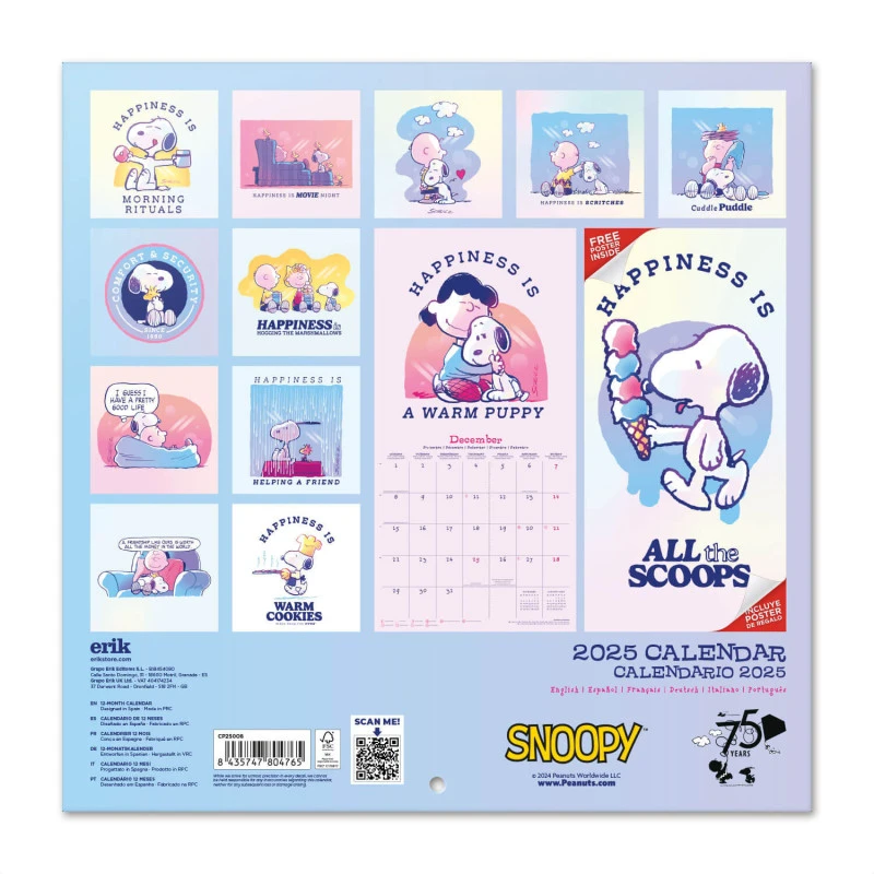 Este calendario de pared de Snoopy tiene una duración total de 12 meses que abarcan desde Enero hasta Diciembre de 2025. Contiene 12 imágenes y un póster en su interior. Respecto a su tamaño, mide 30 centimetros de ancho por 60 de alto (abierto). Idiomas: inglés, español, francés, alemán, italiano y portugués.