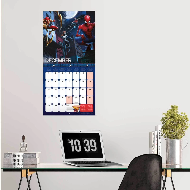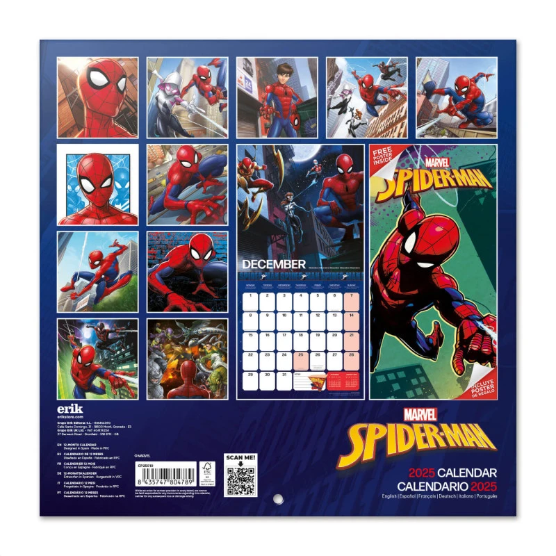 Este calendario de pared de Spider-Man tiene una duración total de 12 meses que abarcan desde Enero hasta Diciembre de 2025. Contiene 12 imágenes y un póster en su interior. Respecto a su tamaño, mide 30 centimetros de ancho por 60 de alto (abierto). Idiomas: inglés, español, francés, alemán, italiano y portugués.