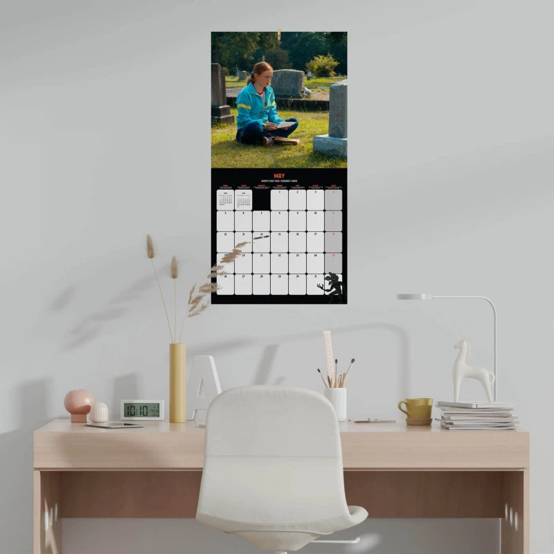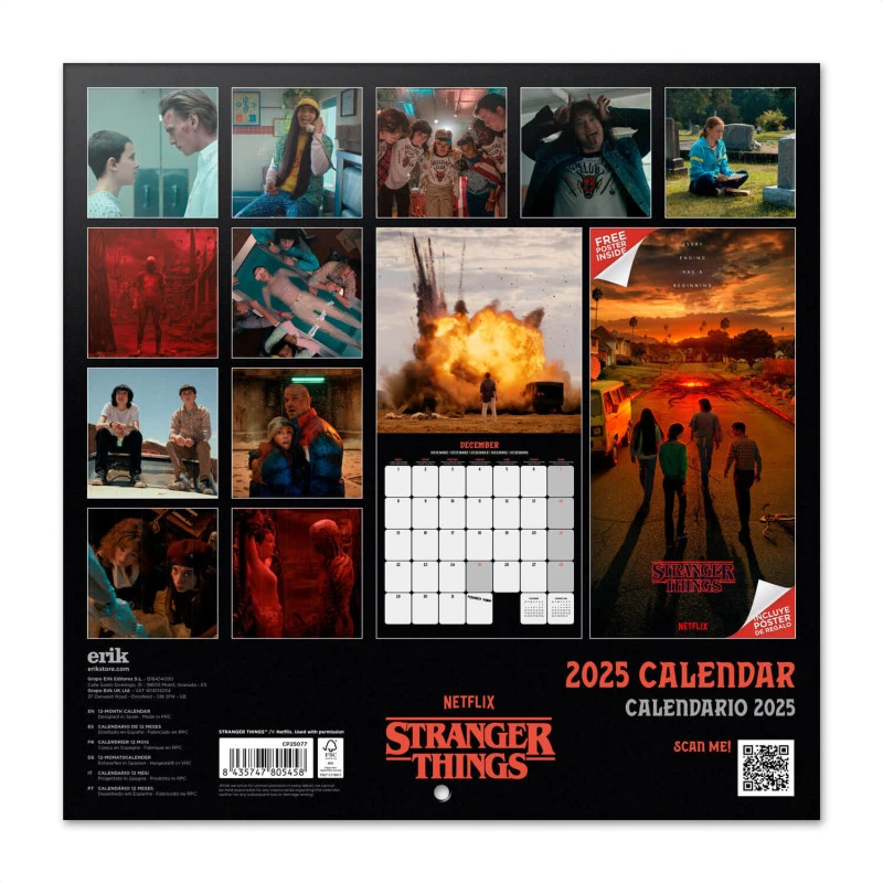Este calendario de pared de Stranger Things tiene una duración total de 12 meses que abarcan desde Enero hasta Diciembre de 2025. Contiene 12 ilustraciones y un póster en su interior. Respecto a su tamaño, mide 30 centimetros de ancho por 60 de alto (abierto). Idiomas: inglés, español, francés, alemán, italiano y portugués.
