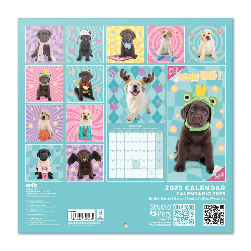El calendario de pared Studio Pets Labrador tiene una duración total de 12 meses que abarcan desde Enero hasta Diciembre de 2025. Contiene 12 imágenes de perros labradores y un póster en su interior. Respecto a su tamaño, mide 30 centimetros de ancho por 60 de alto (abierto). Idiomas: inglés, español, francés, alemán, italiano y portugués.
