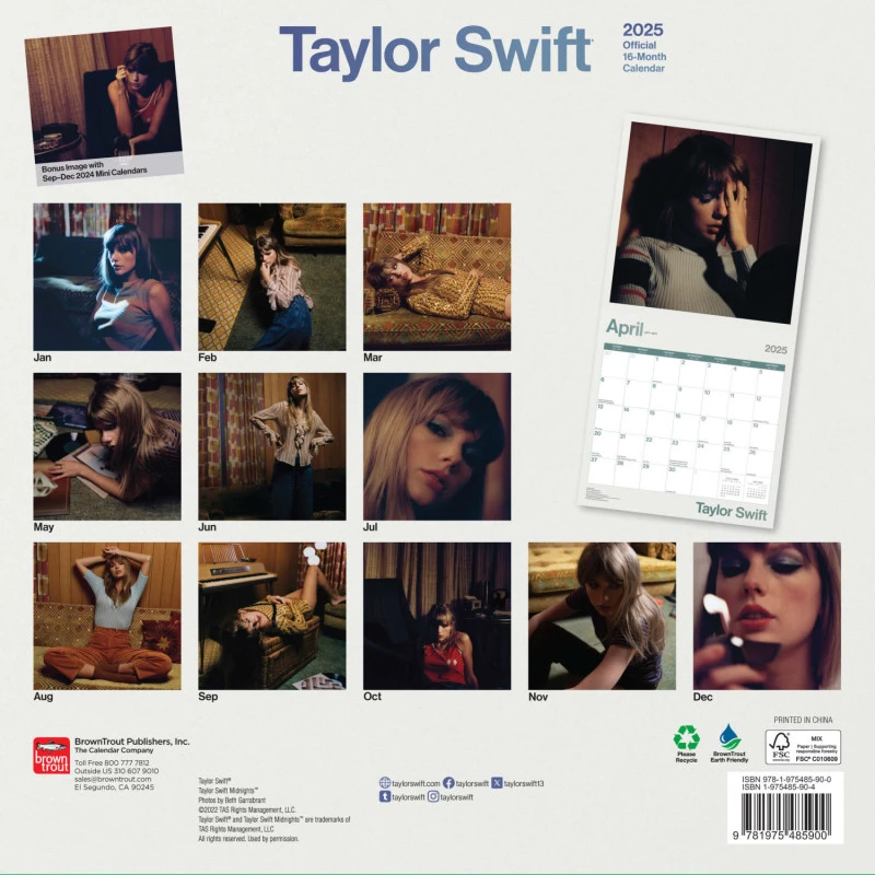 Este calendario de pared de Taylor Swift tiene una duración total de 16 meses que abarcan desde Septiembre de 2024 hasta Diciembre de 2025. Contiene 13 imágenes diferentes en su interior. Los textos están en los siguientes idiomas: inglés, español y francés.