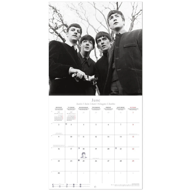 Este calendario de pared de The Beatles tiene una duración total de 12 meses que abarcan desde Enero hasta Diciembre de 2025. Contiene 12 imágenes y un póster en su interior. Respecto a su tamaño, mide 30 centimetros de ancho por 60 de alto (abierto). Idiomas: inglés, español, francés, alemán, italiano y portugués.