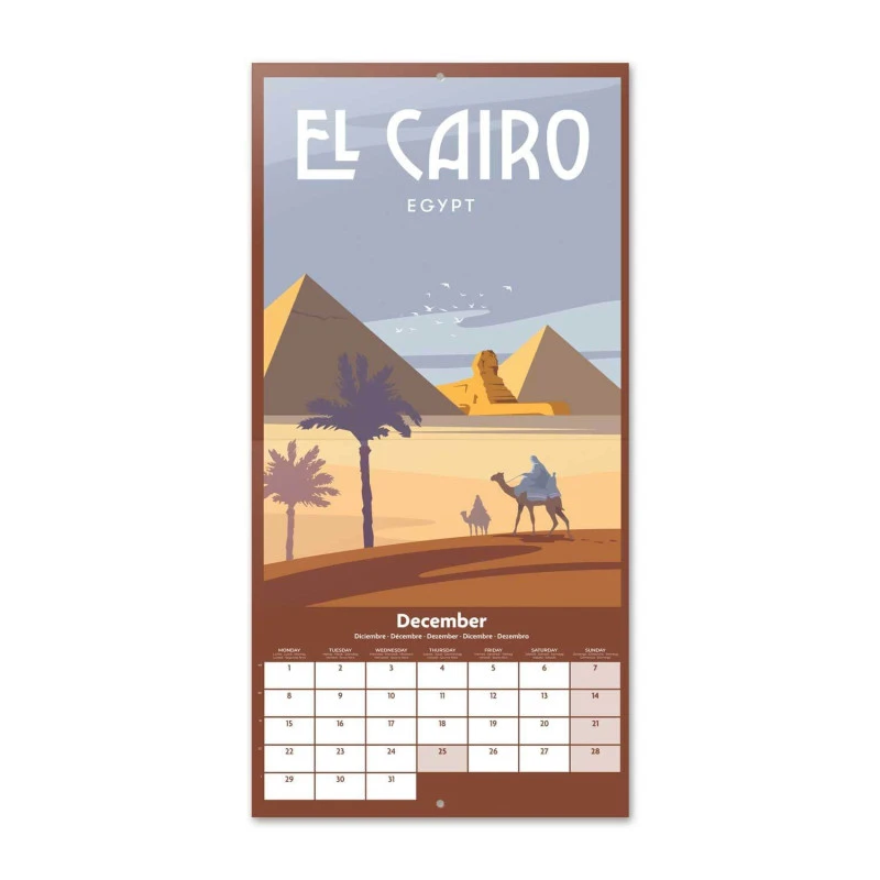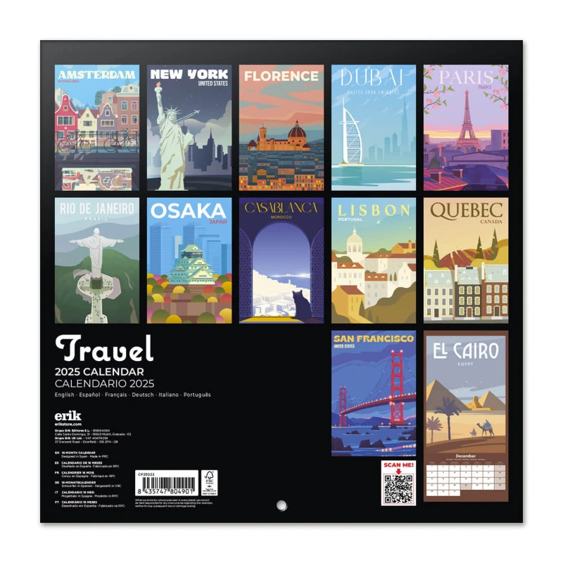 El calendario de pared Travel tiene una duración total de 16 meses que abarcan desde Septiembre de 2024 hasta Diciembre de 2025. Contiene 12 ilustraciones de diferentes lugares del mundo en su interior. Respecto a su tamaño, mide 30 centimetros de ancho por 60 de alto (abierto). Idiomas: inglés, español, francés, alemán, italiano y portugués.