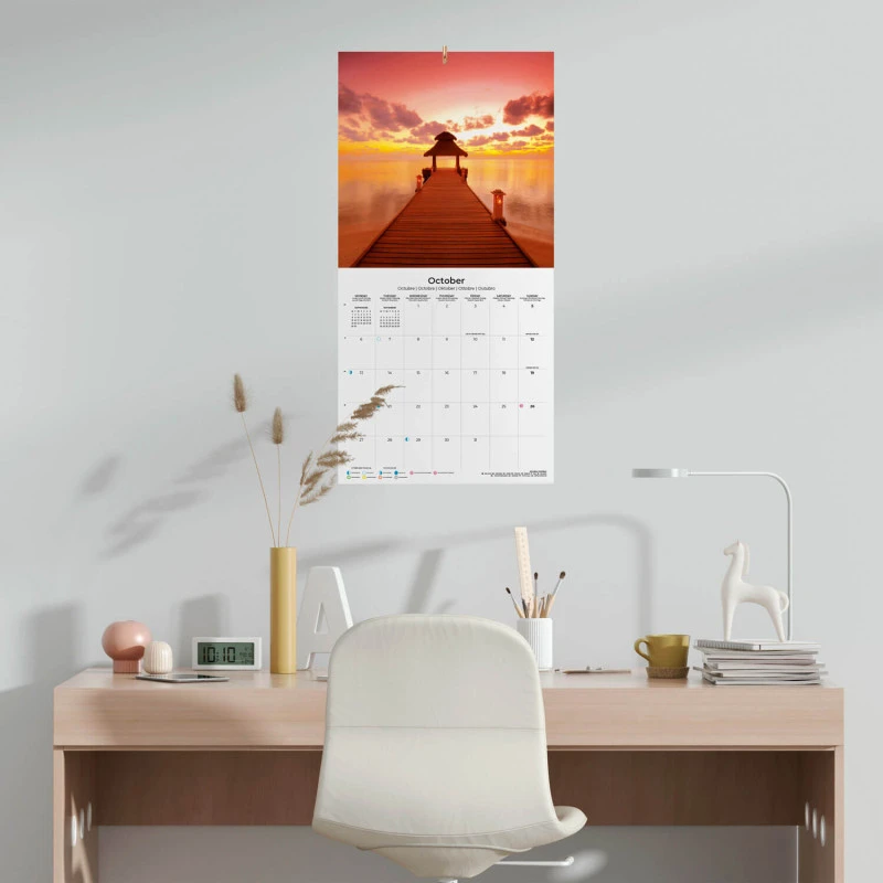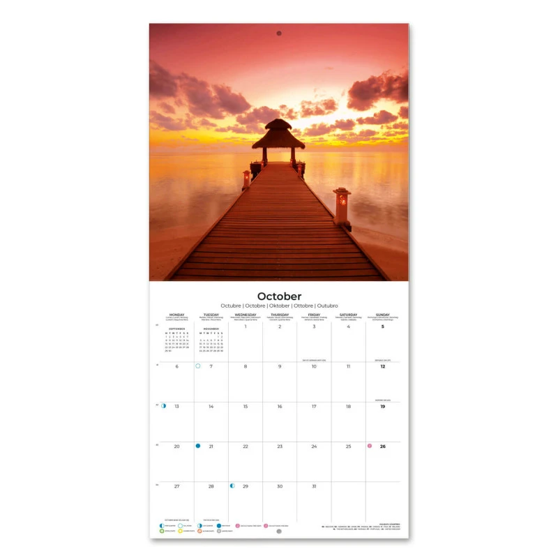 El calendario de pared Tropical Paradise tiene una duración total de 16 meses que abarcan desde Septiembre de 2024 hasta Diciembre de 2025. Contiene 12 imágenes de paisajes tropicales en su interior. Respecto a su tamaño, mide 30 centimetros de ancho por 60 de alto (abierto). Idiomas: inglés, español, francés, alemán, italiano y portugués.