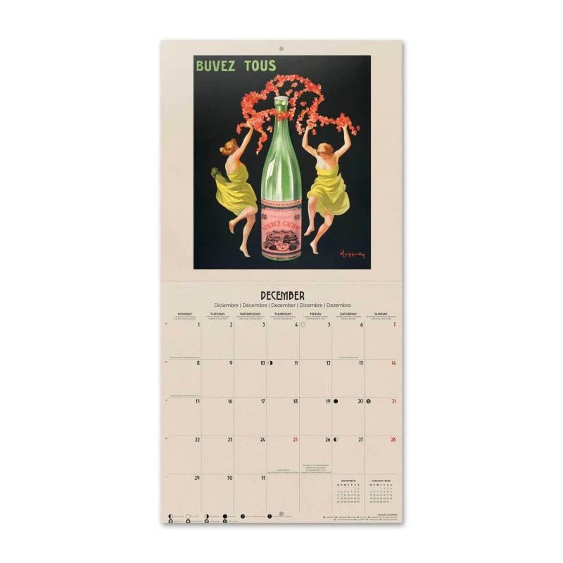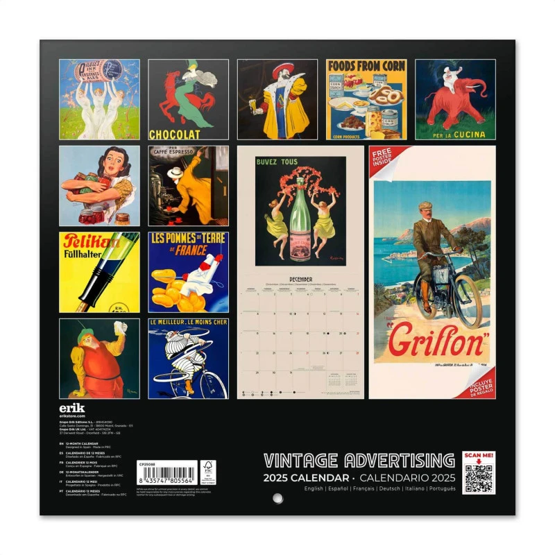 El calendario de pared Vintage Advertising tiene una duración total de 12 meses que abarcan desde Enero hasta Diciembre de 2025. Contiene 12 ilustraciones de anuncios publicitarios vintage y un póster en su interior. Respecto a su tamaño, mide 30 centimetros de ancho por 60 de alto (abierto). Idiomas: inglés, español, francés, alemán, italiano y portugués.