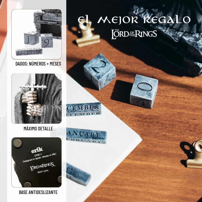 Este calendario perpetuo 3D de El Señor de los Anillos cuenta con un diseño 3D inspirado en un Nazgûl. Cuenta con 5 bloques con números y meses combinables que se pueden intercambiar para configurar todas las fechas posibles del año. Ha sido fabricado en resina y pintado a mano a todo color. Respecto a su tamaño, mide aproximadamente 23 cm de altura y 8,5 cm de diámetro.