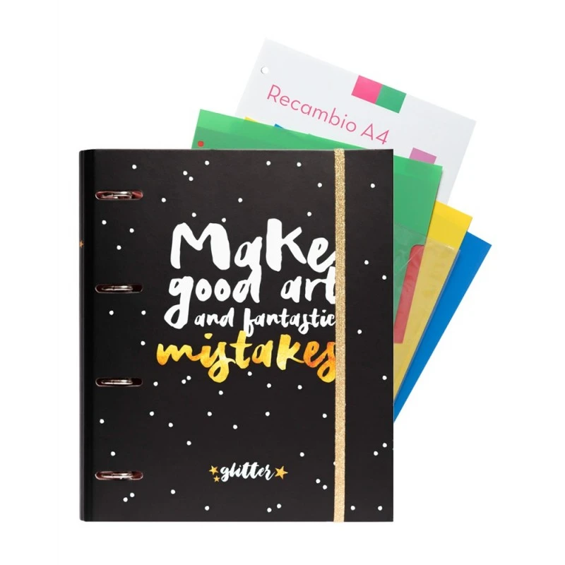 Carpeblock Glitter Stars es la carpeta de toda la vida incluyendo el relleno necesario.! Lista para que estrenes los bolis! Hecho con tapa dura de cartón de 2 mm de espesor y forrado en papel con acabado en mate. Tiene un tamaño de 26 X 32 cm, encuadernación de 4 anillas, cierre con banda elástica de 9 mm y diseño interior personalizado. Incluye un pack de 100 hojas cuadriculadas (5×5 mm) de 80 gr tamaño A4, 4 separadores de polipropileno y un sobre de plástico transparente.