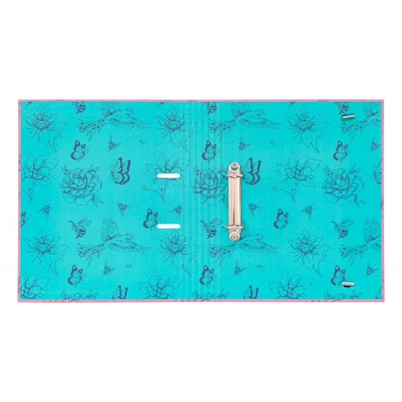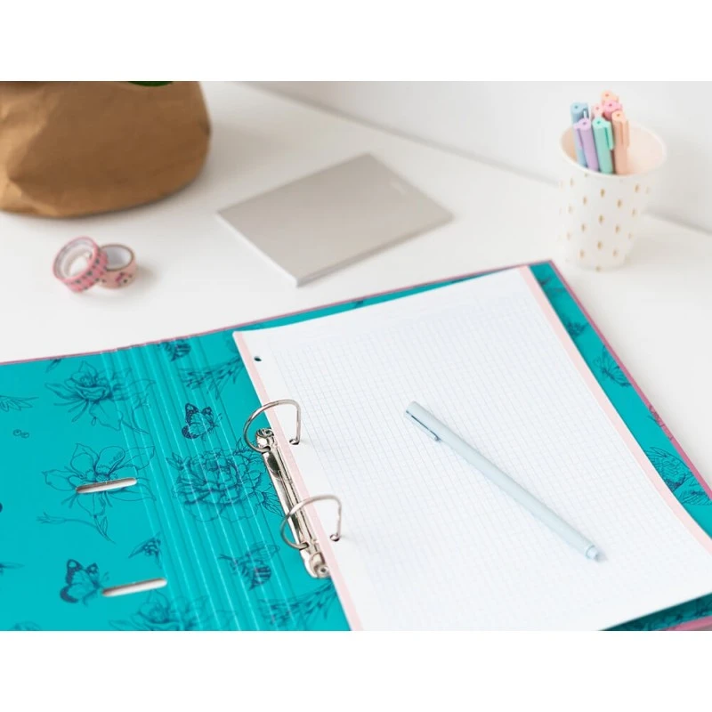 Encuadernación de 2 anillas y cierre de banda elástica de 9 mm. Pensada para almacenar, principalmente, hojas tamaño A4.