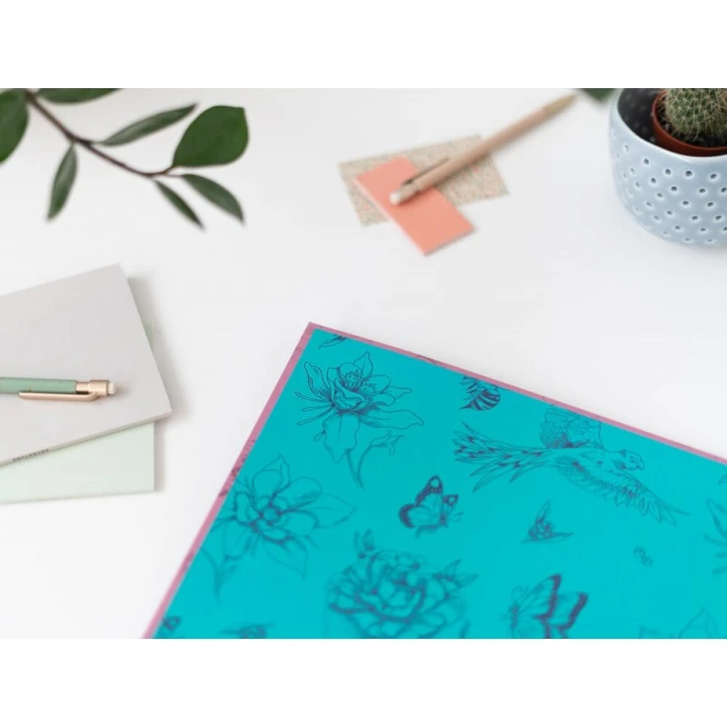 - Elaborada en tapa dura de cartón de 2 milímetros, forrada con papel laminado en mate.
