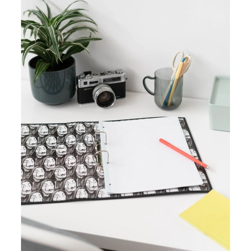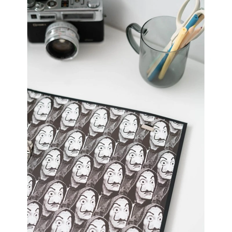 «Una mattina mi sono alzato O bella ciao, bella ciao, bella ciao, ciao, ciao,» Nos gusta imaginar al Profesor organizando el atraco con esta acarpeta troquelada con 4 anillas Premium. Organiza tus documentos de Muggle en él y no perderás nada, ¡no prometemos nada!. Fabricada con materiales de una gran calidad, elaborada con tapa dura de cartón de 2 mm de espesor y forradas con papel laminado en mate y detalles en foil stamp. Tienen un tamaño de 26×32 cm, encuadernación de 4 anillas, cierre con banda elástica de 9 mm y diseño interior personalizado.