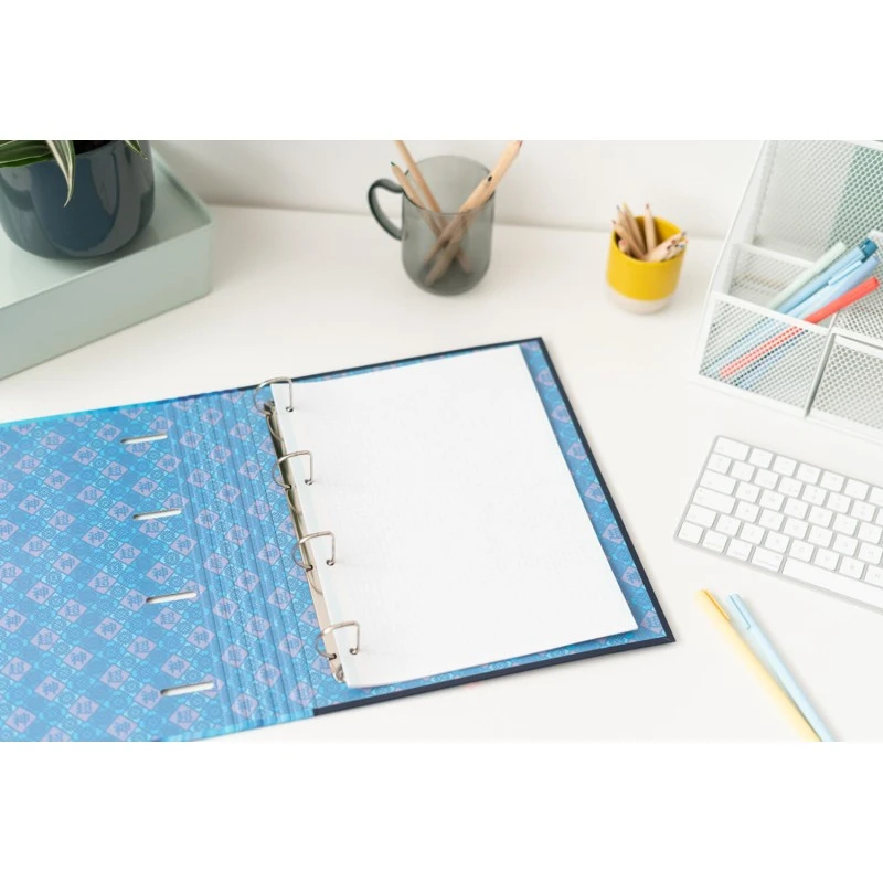 Tapa durade 2 mm de espesor y forradas con papel laminado en mate. Tamaño: 32×28 cm, encuadernación de 4 anillas, banda elástica de 9 mm y diseño interior personalizado.