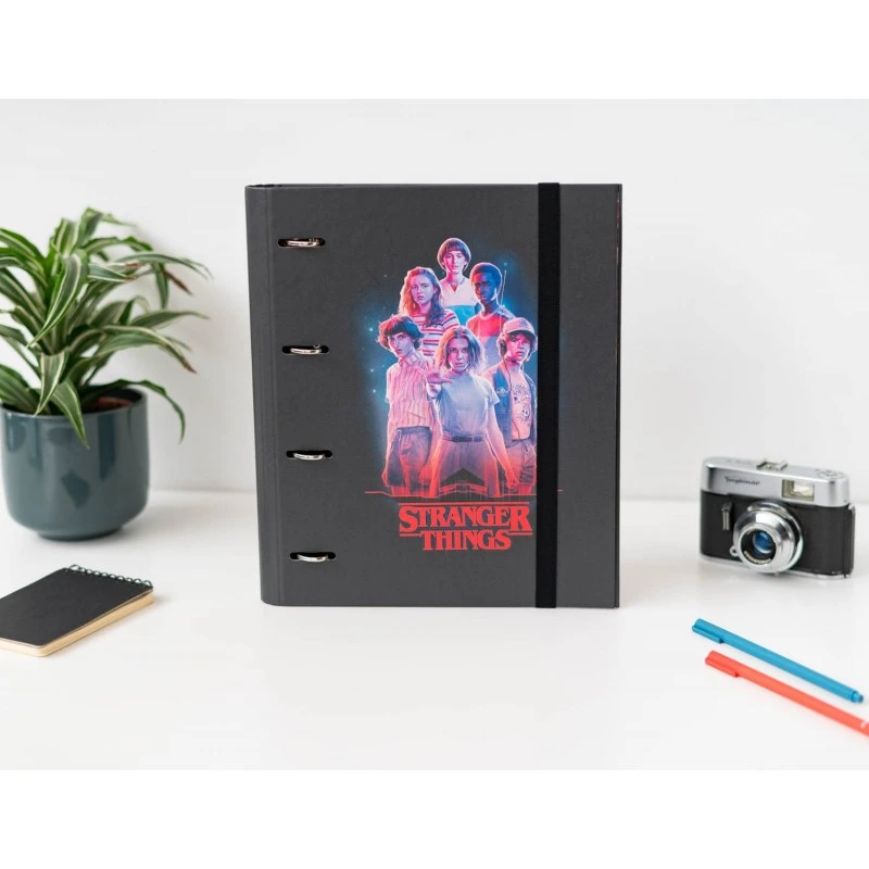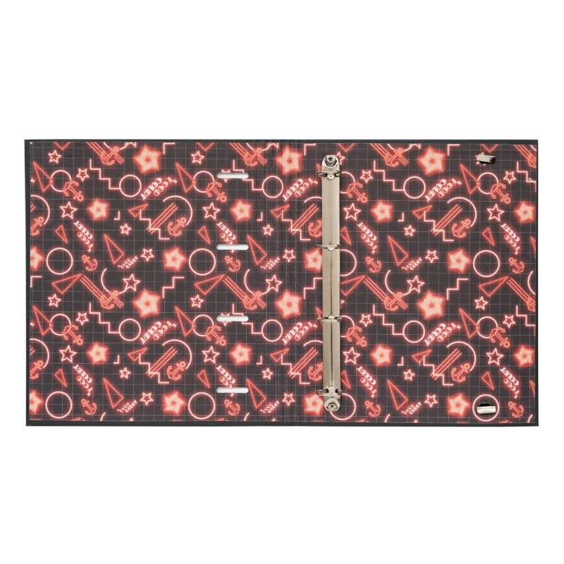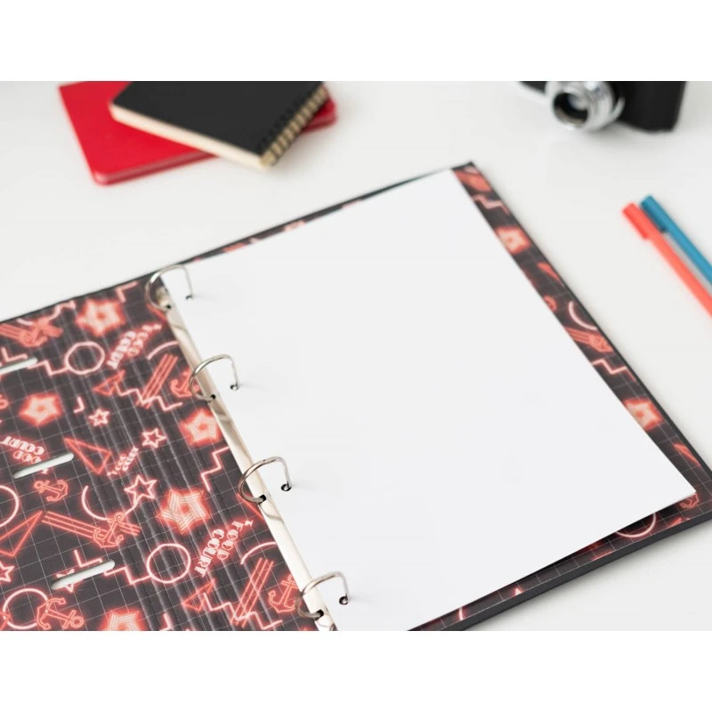 Encuadernación de 4 anillas y cierre de banda elástica de 9 mm. Pensada para almacenar, principalmente, hojas tamaño A4.